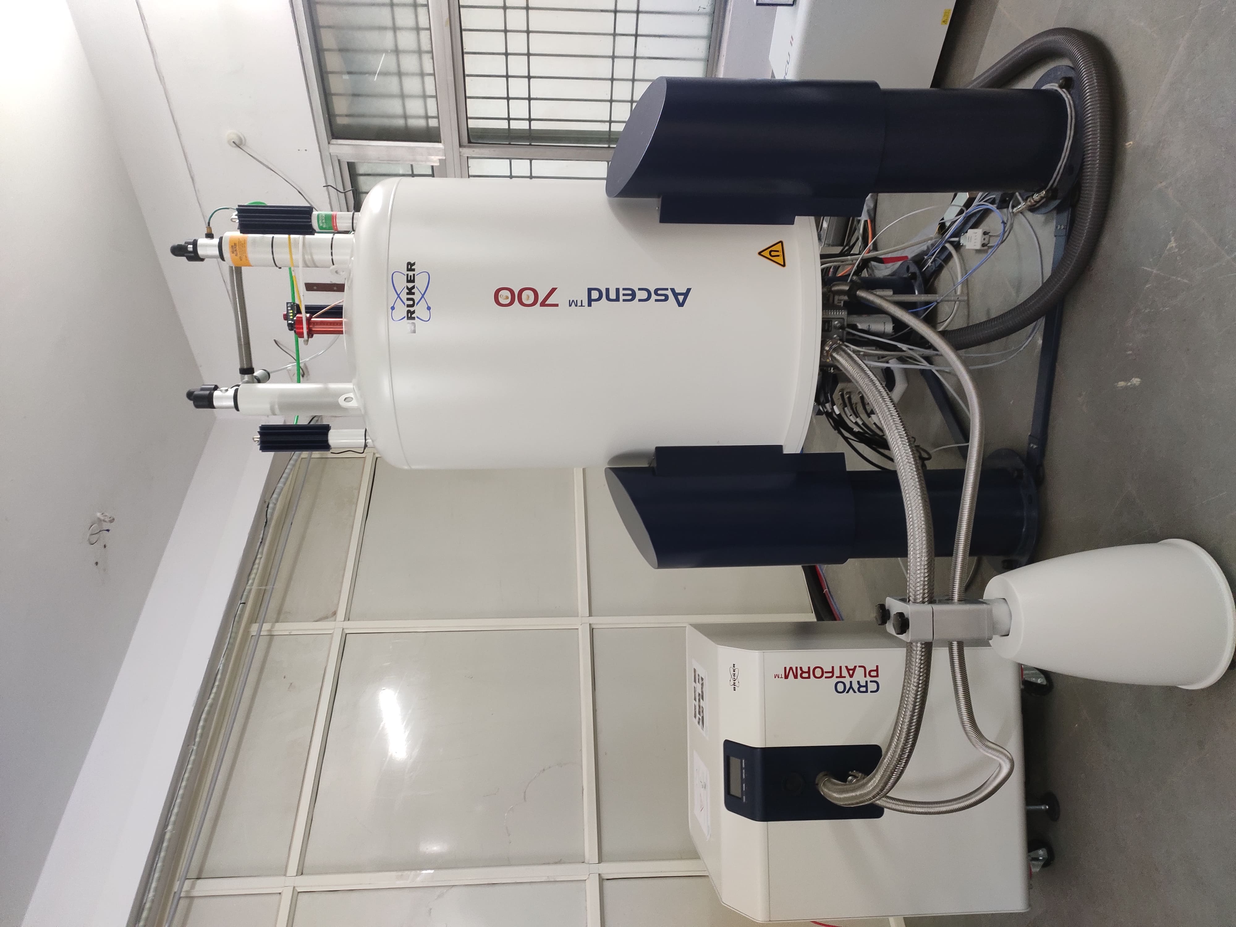 Description : The Central Advanced Instrumentation Facility at the IISER Berhampur houses a Bruker Ascend ™ 700 MHz AVANCE NEO NMR spectrometer. The primary mission of this Central Advanced NMR Facility is to make NMR spectroscopy available to researchers of the Institute, and to a limited extent, to the academic and industrial labs in the vicinity. Basic training for experimental liquid state NMR is provided to PhD students and postdocs, enabling them to perform their own NMR experiments. Advanced experimental liquid state NMR spectroscopy (running 2D experiments, multidimensional NMR, etc.) is performed by the technical staff. Most standard NMR experiments have been implemented on the spectrometer. Features The following operations can be carried out with this instrument: 1. 1D (1 H 1 and C 13) NMR spectra measurement. 2. Determination of13C atomic group by means of DEPT-135 and DEPT-90. 3. X-Nuclei 15N and 13C. 4. 2D measurement includes 2D 1H-1H COSY, NOESY ROESY TOCSY, 1H-1