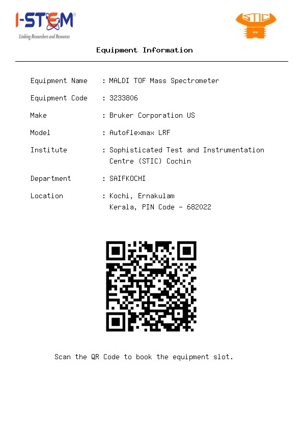 High Performance MALDI Time of Flight Mass Spectrometer with Linear and Reflectron modes capable of mass analysis of Small Molecules, Polymers (Synthetic and Bio polymers), MOF, Dendrimers, Supramolecular assemblies, Proteins and Peptides. of Oligonucleotides, Nucleic acids, PNA-DNA Hybrids. Bruker