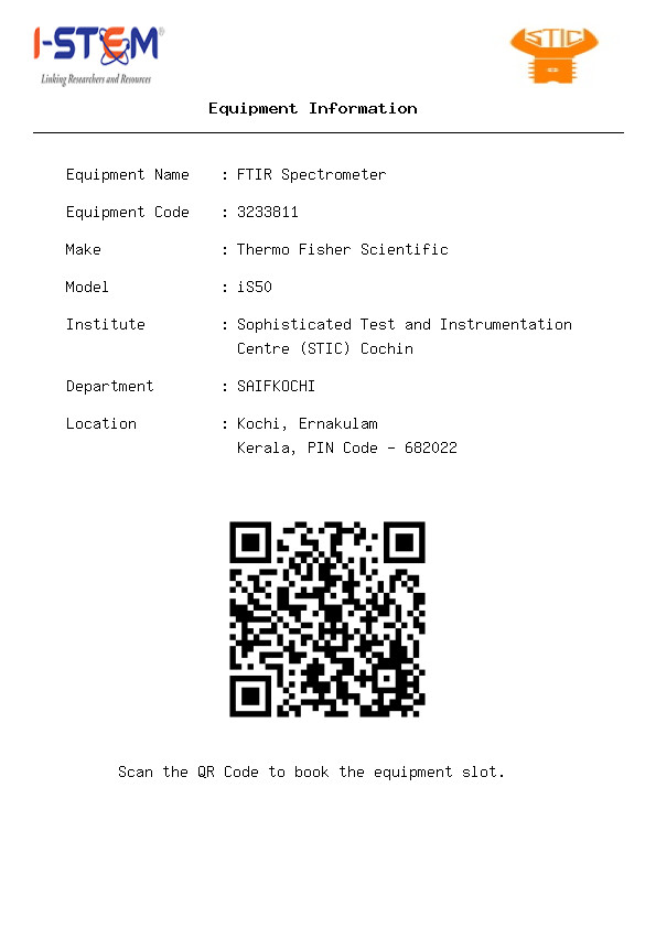 4000 cm-1 to 100cm-1 Resolution 0.2 cm-1 , S/N Ratio 55,000:1 ATR- Diamond crystal, Liquid Cell, Gas Cell attachments IR library